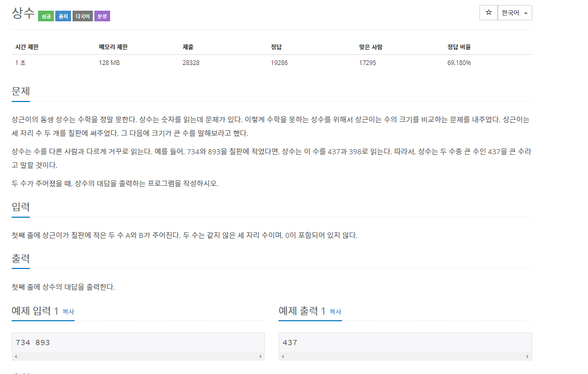 2020/04/20 코딩 문제 연습(7단계 / 백준 2908번) C++ / atoi, string을 int형으로 본문